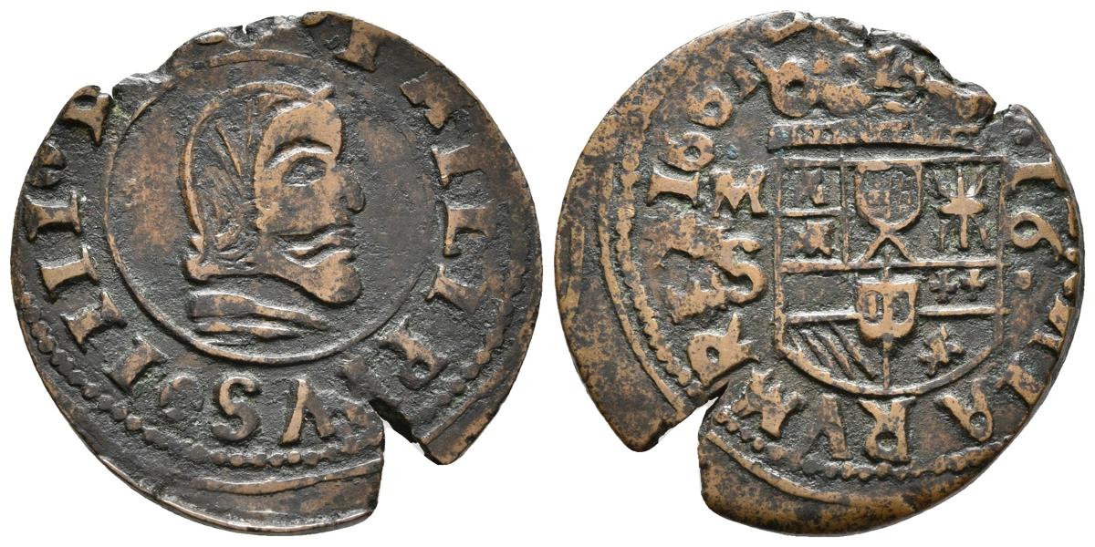 FELIPE IV. 16 Maravedís.1661. Madrid S. Falsa de época. Año imposible para este ensayador. J.S. Pág. 441-442. Ae. 4,22g. MBC+.