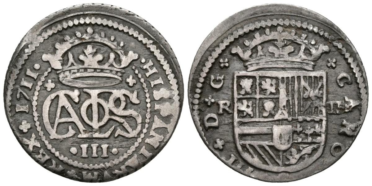 CARLOS III, el Pretendiente. 2 Reales. 1711. Barcelona. Cal-27. Ar. 4,65g. MBC-.