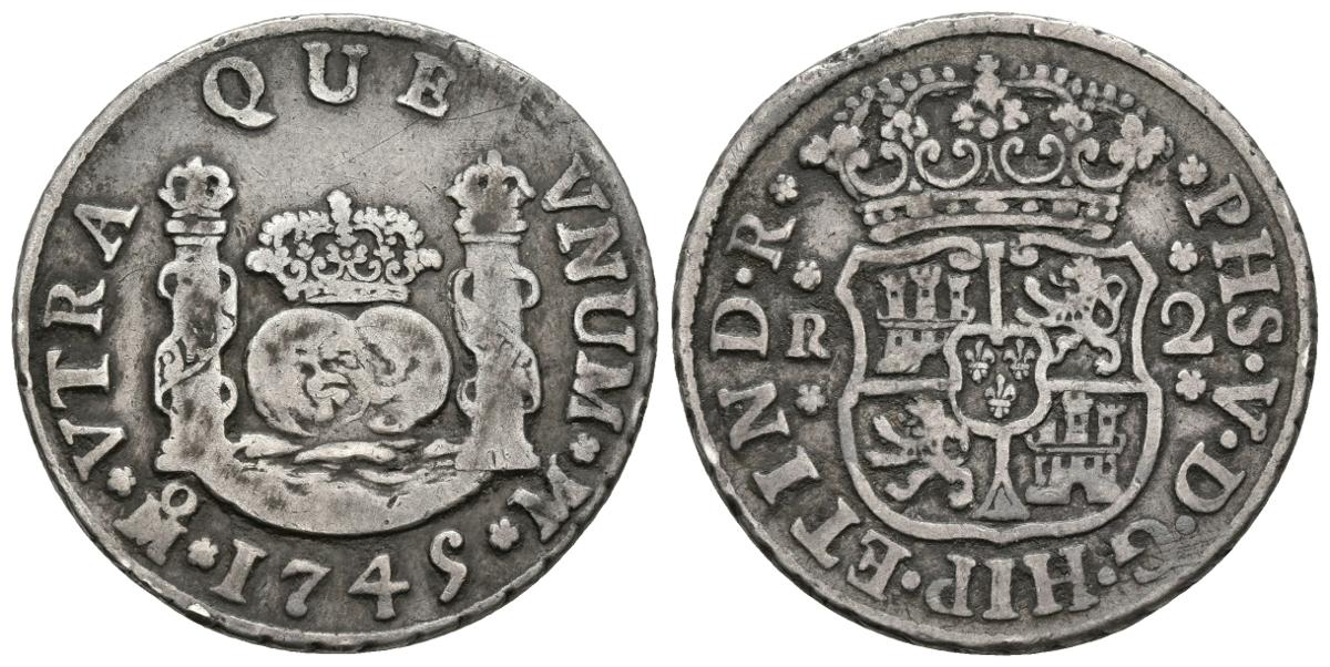 FELIPE V. 2 Reales. 1745. México M. Columnario. Variante HIP en lugar de HISP. Cal-1298. Ar. 6,54g. MBC. Rara.