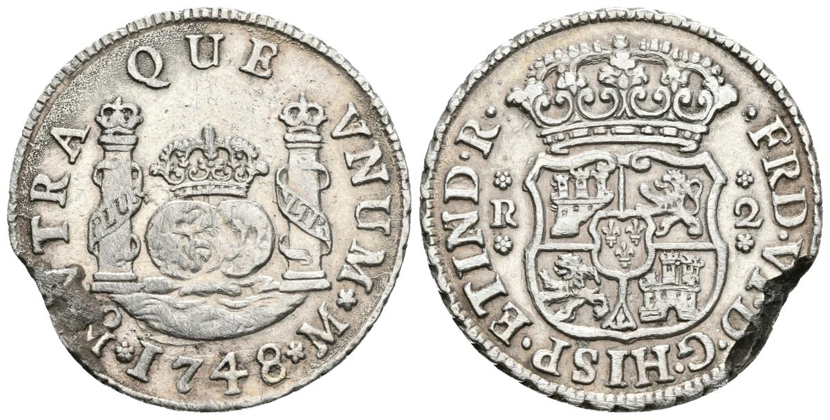 FERNANDO VI. 2 Reales. 1748. México M. Columnario. Cal-488. Ar. 6,56g. Cospel faltado por oxidación. MBC+. Escasa.