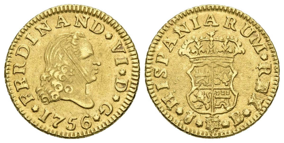 FERNANDO VI. 1/2 Escudo. 1756. Madrid JB. Cal-253. Au. 1,77g. Rayitas de ajuste. MBC.
