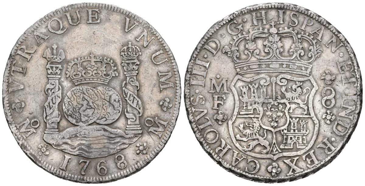 CARLOS III. 8 Reales. 1768. México MF. Columnario. Cal-908. Ar. 27,13g. Pátina. MBC+.