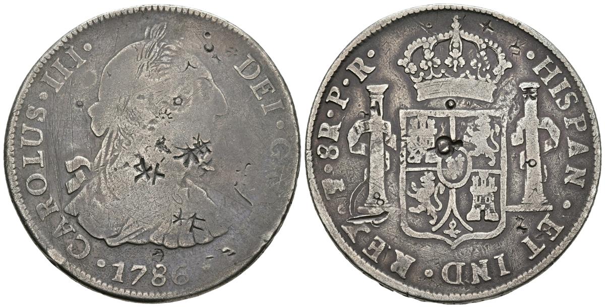 CARLOS III. 8 Reales. 1786. Potosí PR. Cal-994. Ar. 26.17g. Flan grande. Resellos chinos. BC/BC+.