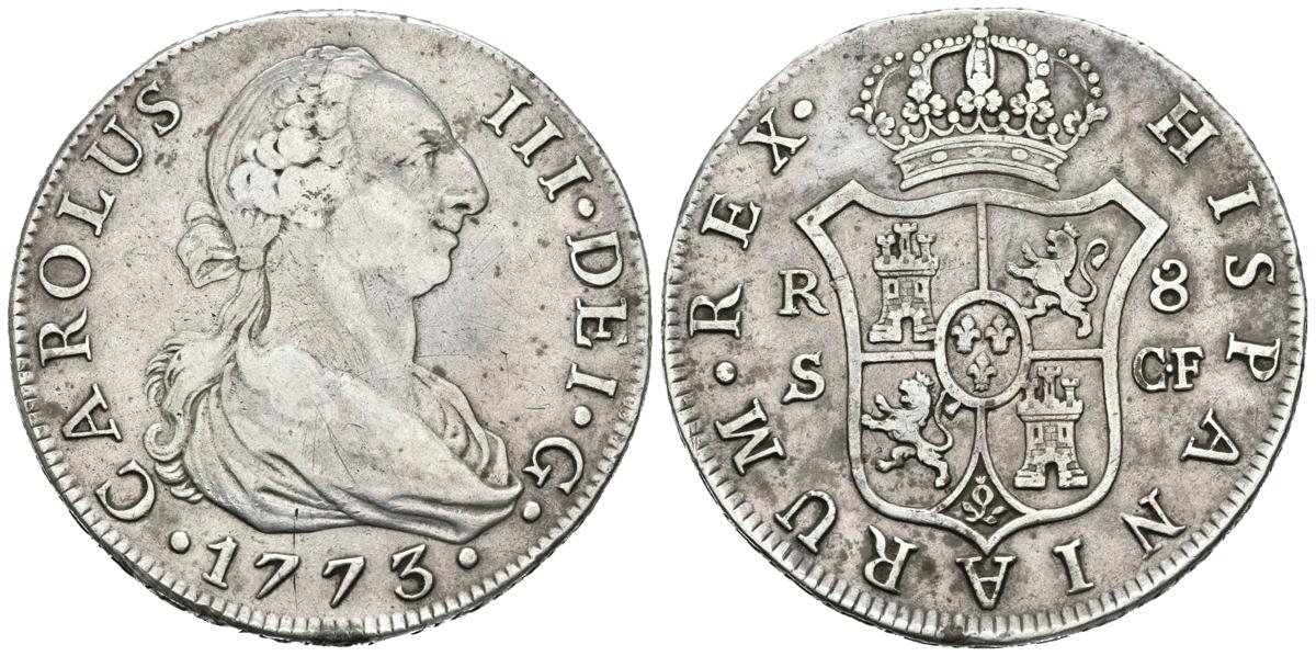 CARLOS III. 8 Reales. 1773. Sevilla CF. Cal-1034. Ar. 26,69g. MBC/MBC+. Rara.