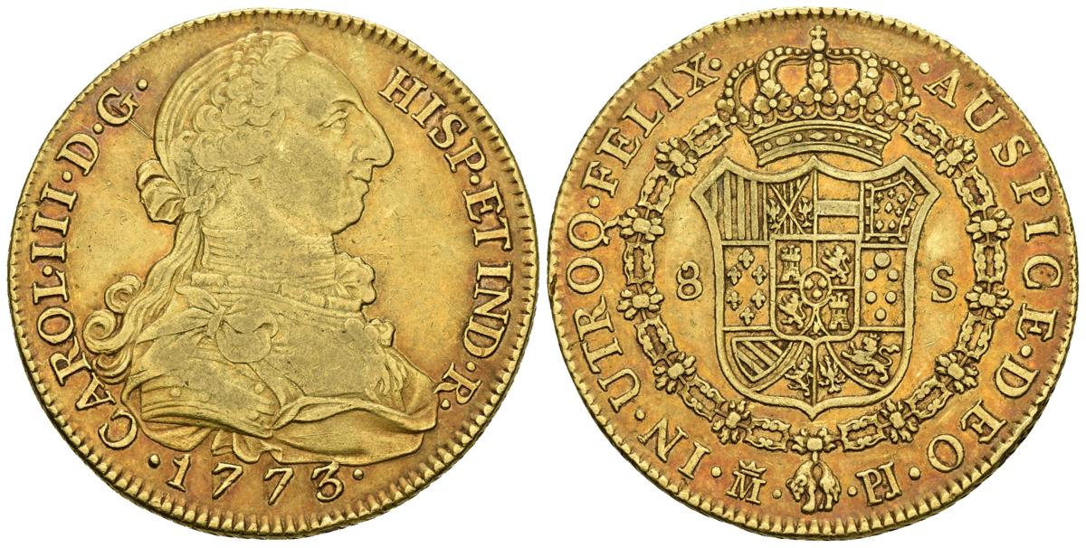CARLOS III. 8 Escudos. 1773. Madrid PJ. Sin punto entre los ensayadores. Cal-52; Cal. Onza 721var. Au. 27,01g. Bonito color. MBC/MBC+. Rara.