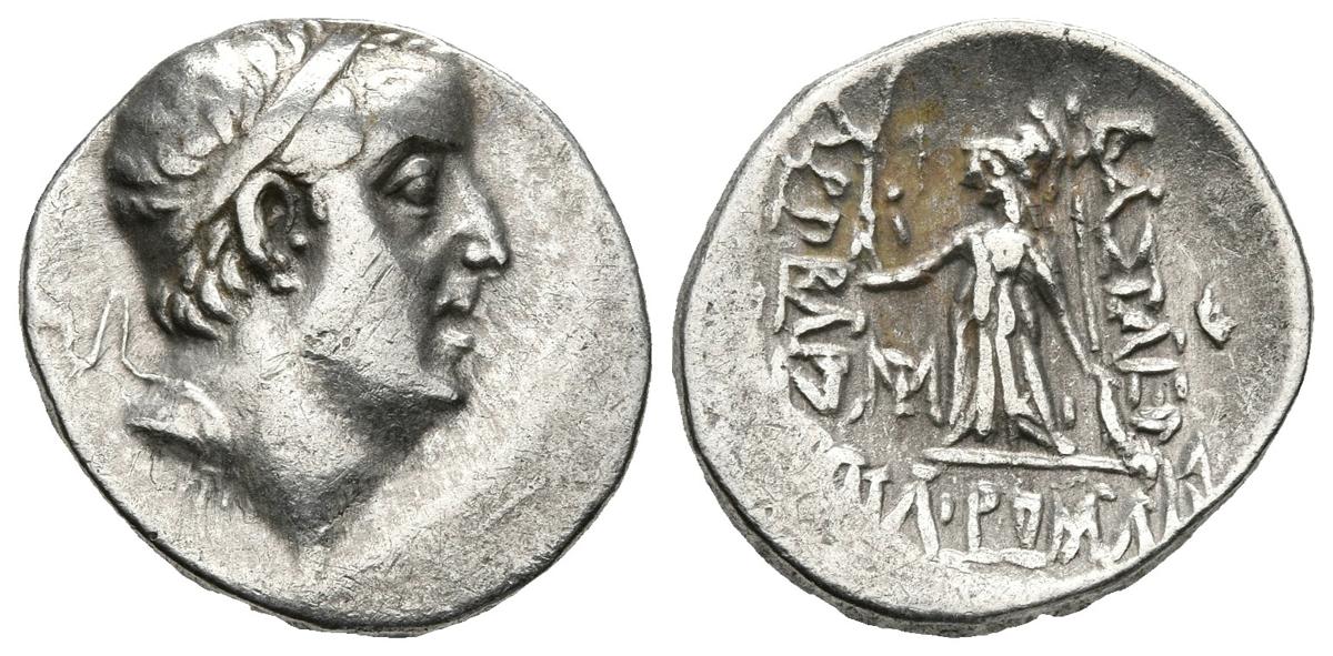 REYES DE CAPPADOCIA. Ariobarzanes I Philoromaios. Dracma. 96-63 a.C. A/ Cabeza con diadema de Ariobarzanes a derecha. R/ Athena estante a izquierda con lanza y escudo, esta sostiene Victoria. Monograma a la izquierda MI. Simonetta 44a; HGC 7, 846. Ar. 4,05g. MBC+.