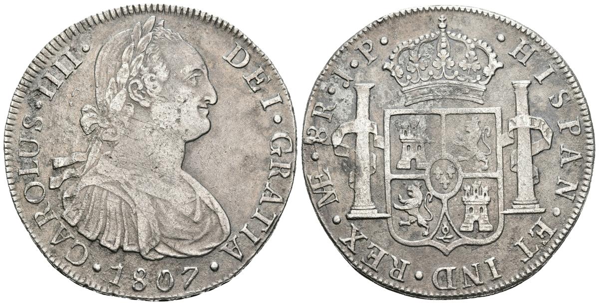 CARLOS IV. 8 Reales. 1807. Lima JP. Cal-664. Ar. 26,98g. Oxidaciones limpiadas. MBC.