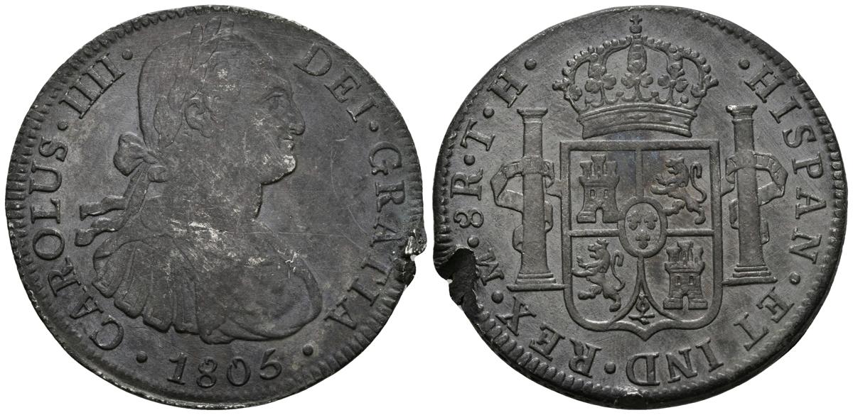 CARLOS IV. 8 Reales. 1805. México TH. Cal-703. Ar. 26,58g. Pátina gruesa oscura y golpe en el canto. MBC/MBC+.