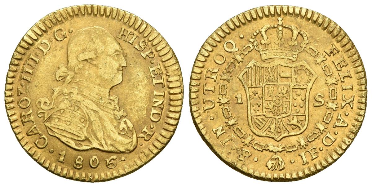 CARLOS IV. 1 Escudo. 1806. Popayán JF. Cal-539; Restrepo 85-34. Au. 3,36g. MBC. Escasa.
