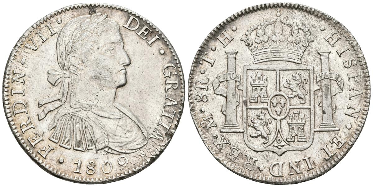 FERNANDO VII. 8 Reales. 1809. México TH. Busto imaginario. Cal-539. Ar. 27,00g. Brillo original. EBC+/SC-. Escasa así.