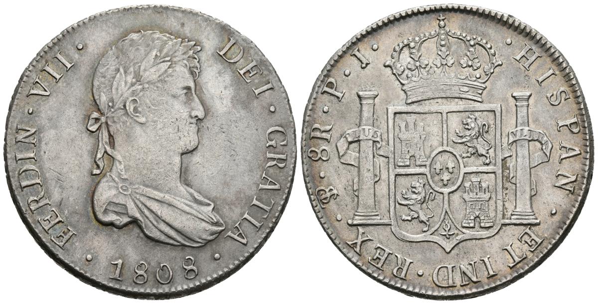 FERNANDO VII. 8 Reales. 1808. Potosí PJ. Cal-599. Ar. 26,97g. Suave pátina. MBC+.