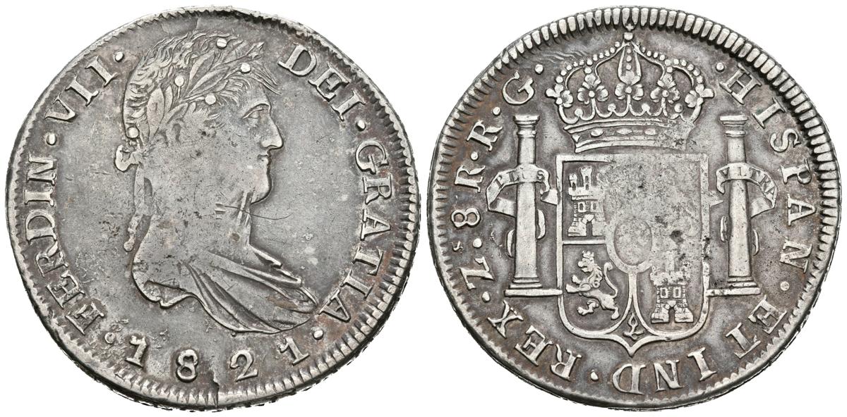 FERNANDO VII. 8 Reales. 1821. Zacatecas RG. Cal-697. Ar. 26,12g. Vano en reverso. MBC.