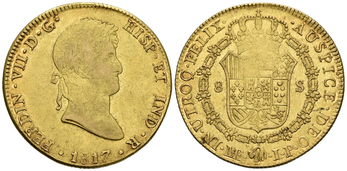 FERNANDO VII. 8 Escudos. 1817. Lima JP. Cal-23; Cal. Onza 1226. Au. 26,93g. Leves rayitas en anverso. MBC/MBC+.
