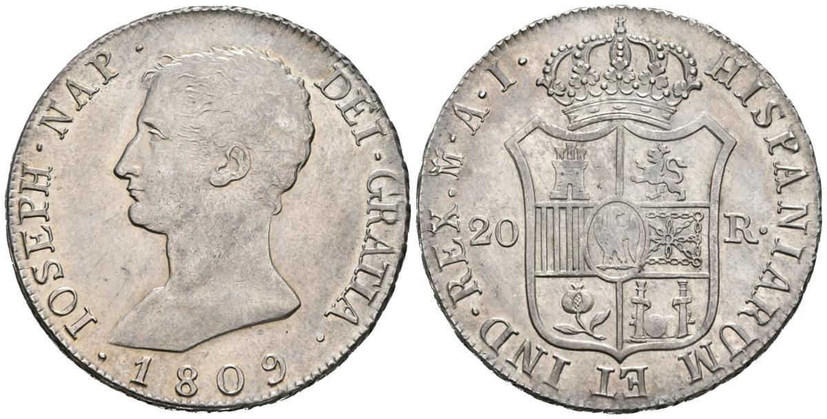 JOSE NAPOLEON. 20 Reales. 1809. Madrid AI. Cal-24. Ar. 27,25g. Bonito ejemplar. SC-/EBC+. Brillo original.Ex Martí Hervera & Soler y Llach 74 Nº571 (28/12/2012)