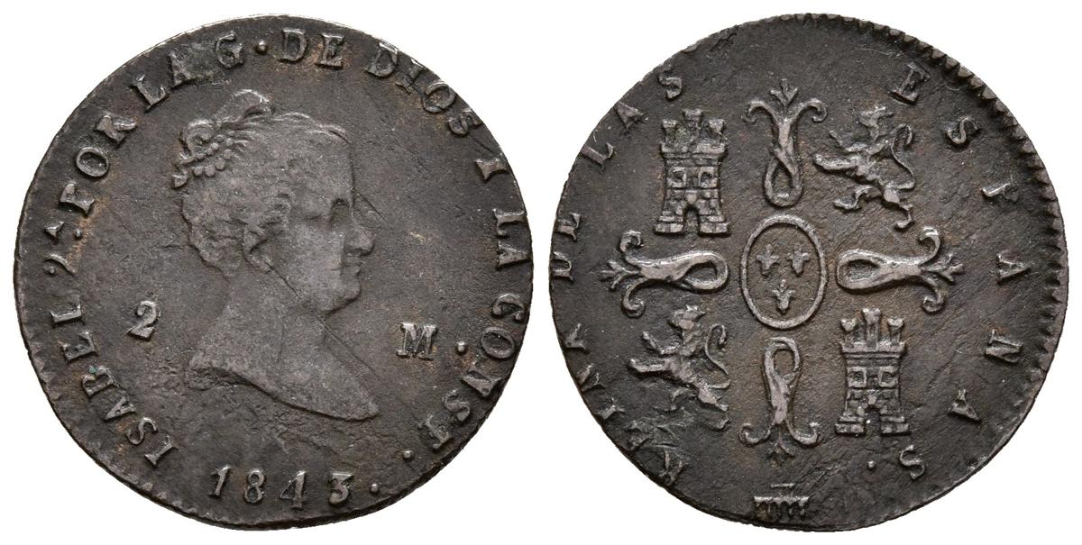 ISABEL II. 2 Maravedís. 1843. Segovia. Cal-555var. Ae. 1,71g. Cospel fino. MBC+.