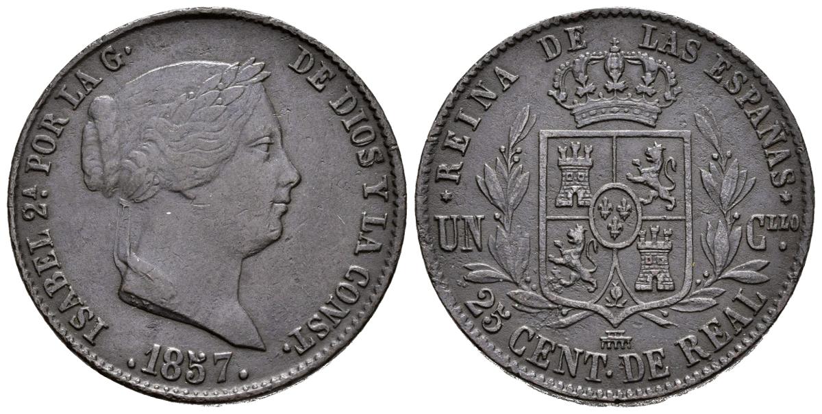 ISABEL II. 25 Céntimos de Real. 1857. Segovia. Cal-592. Ae. 9,91g. MBC/MBC+.