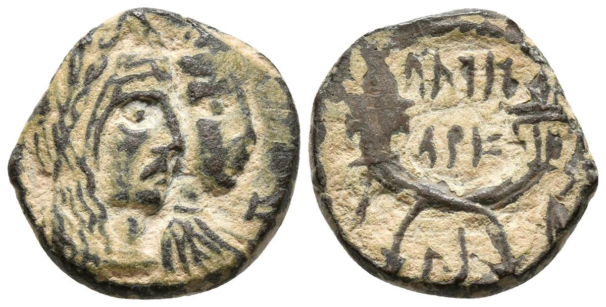 REINO NABATEO. Aretas IV con Shaqilath I. Ae. 9 a.C.-40 d.C. Petra. A/ Bustos drapeados de Aretas con pelo largo y corona junto a Shaqilah. R/ Doble cornucopia. BMC 14-22; S. GIC. 5699. Ae. 5,24g. MBC+. Escasa así.