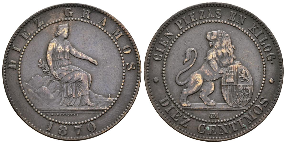 GOBIERNO PROVISIONAL. 10 Céntimos. 1870. Barcelona OM. Cal-24. Ae. 9,99g. MBC+.