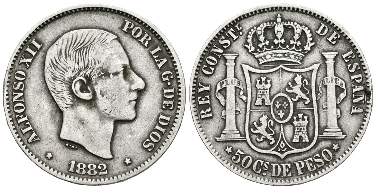 ALFONSO XII. 50 Centavos de Peso. 1882. Manila. Cal-82. Ar. 12,85g. MBC.
