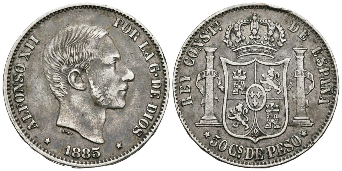 ALFONSO XII. 50 Centavos de Peso. 1885. Manila. Cal-86. Ar. 12,90g. Pátina. MBC.