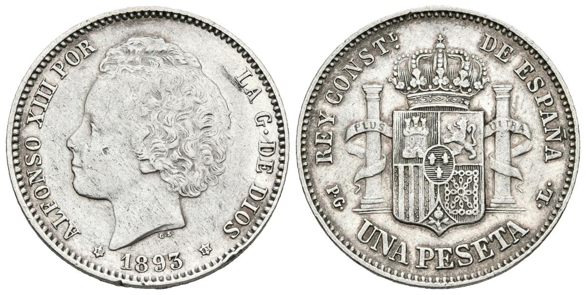 ALFONSO XIII. 1 Peseta. 1893 *18-93. Madrid PGL. Cal-39. Ar. 5,00g. Marquita en la mejilla y leve golpe en el canto. EBC-.