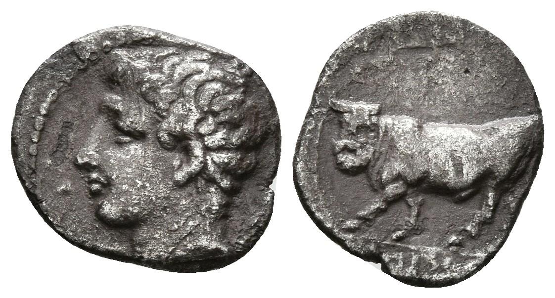 SICILIA, Panormos (Como Ziz). Litra. 400-380 a.C. A/ Cabeza masculina juvenil a izquierda. R/ Toro en marcha con cabeza de hombre barbada a izquierda, la cabeza vuelta mirando de frente, debajo leyenda púnica. CNP 395; HGC 2, 1050 corr. (litra)var. Ar. 0,51g. MBC.