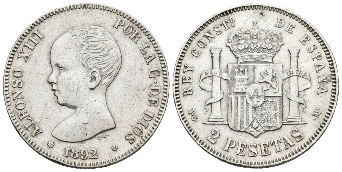 ALFONSO XIII. 2 Pesetas. 1892 *18-92. Madrid PGM. Cal-32. Ar. 10,00g. MBC-.