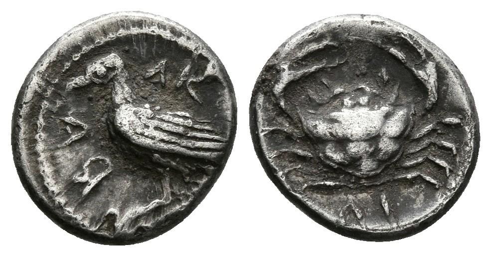 SICILIA, Akragas. Litra. 450-439 a.C. A/ Aguila marina en pie a izquierda, alrededor AK-PA, parcialmente retrograda. R/ Cangrejo, debajo marca de valor AI. HGC 2, 121; SNG ANS 989-995. Ar. 0,68g. MBC+.