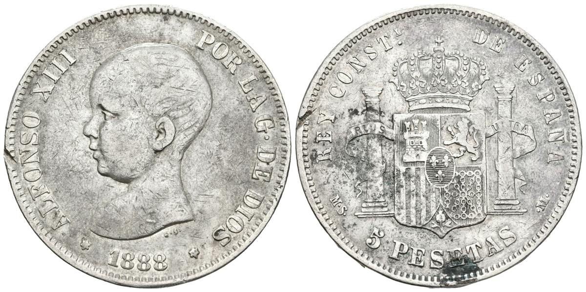 ALFONSO XIII. 5 Pesetas. 1888 *18-88. Madrid MSM. Cal-12. Ar. 24,69g. Marca en anverso y reverso. MBC. Muy rara.