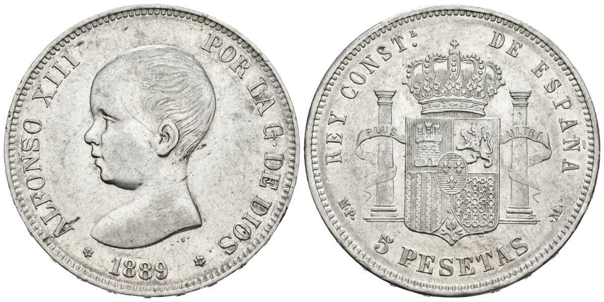 ALFONSO XIII. 5 Pesetas. 1889 *18-89. Madrid MPM. Cal-14. Ar. 24,82g. Bella. MBC+.
