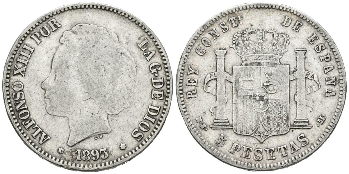 ALFONSO XIII. 5 Pesetas. 1893 *18-. Madrid MSM. Falsa de época en plata. No coincidente. Ar. 24,69g. MBC-.