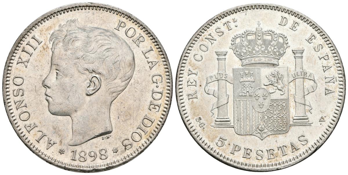 ALFONSO XIII. 5 Pesetas. 1898 *18-98. Madrid SGV. Cal-27. Ar. 24,72g. Brillo original. Marquitas. EBC+.