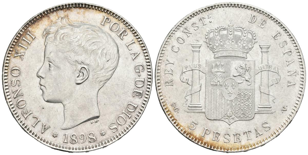 ALFONSO XIII. 5 Pesetas. 1898 *18-98. Madrid SGV. Cal-27. Ar. 24,95g. Marquitas. EBC-/EBC+.