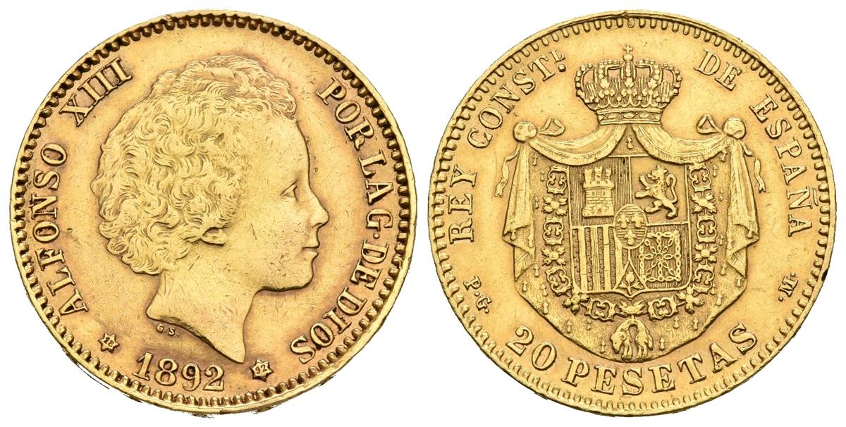 ALFONSO XIII. 20 Pesetas. 1892 *18-92. Madrid PGM. Cal-6. Au. 6,47g. MBC+.