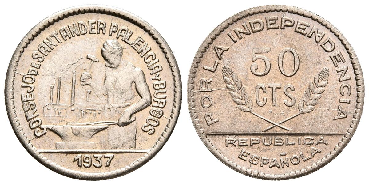 SANTANDER, PALENCIA y BURGOS. 50 Céntimos. 1937. Cal-16, como serie completa. 2,73g. SC.