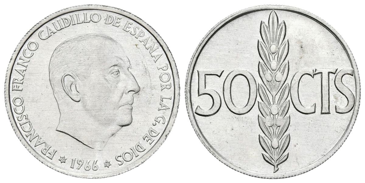 ESTADO ESPAÑOL. 50 Céntimos. 1966 *19-70. Procedente de tira F.N.M.T. Cal-117. Al. 0,96g. Leve manchita en reverso. SC-.