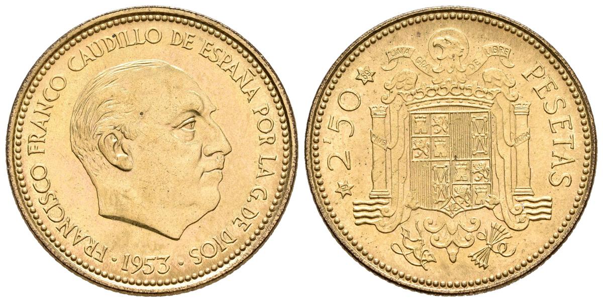 ESTADO ESPAÑOL. 2,50 Pesetas. 1953 *19-69. Procedente de tira F.N.M.T. Tirada: 2.000 piezas. Cal-71. 7,09g. SC-. Rara.