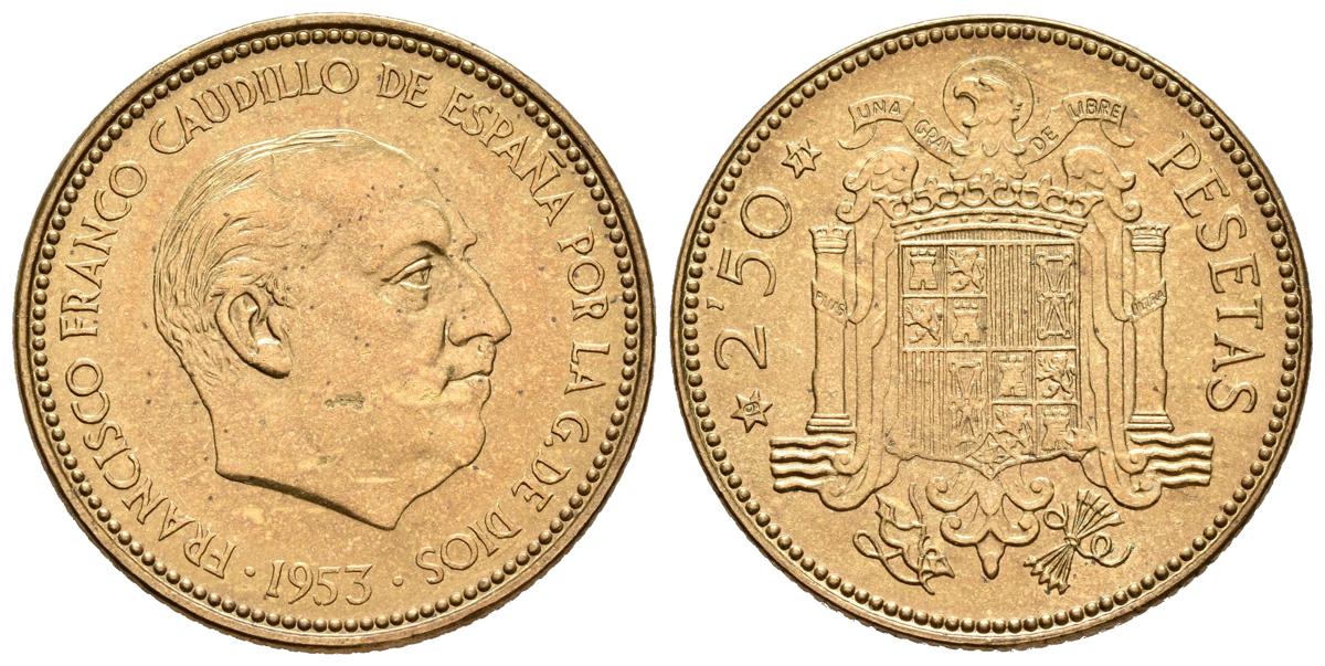 ESTADO ESPAÑOL. 2,50 Pesetas. 1953 *19-71. Procedente de tira F.N.M.T. Cal-73. 7,17g. Tono. Impurezas en el cuño. SC-.