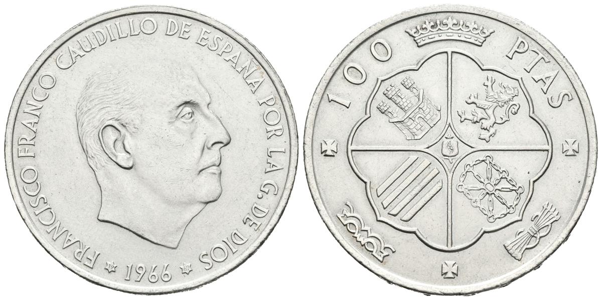 ESTADO ESPAÑOL. 100 Pesetas. 1966 *19-69 (Palo curvo). Cal-14. Ar. 19,17g. EBC+. Escasa.
