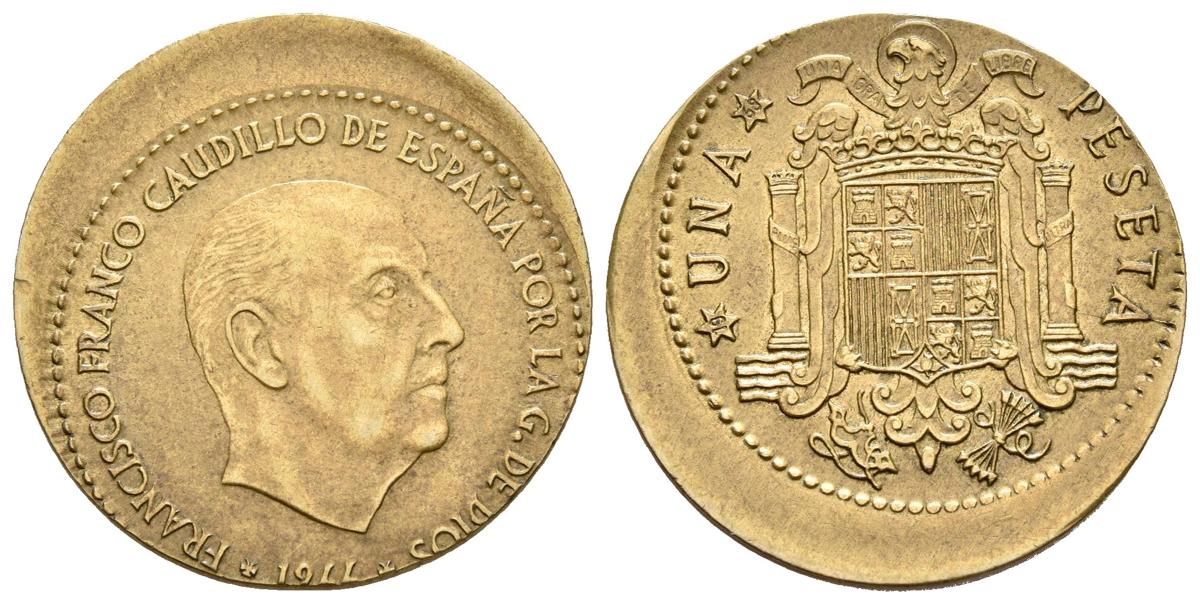 ESTADO ESPAÑOL. 1 Peseta 1966 *19-68. Acuñación desplazada 3mm. Cal-96. 3,46g. MBC+/EBC.