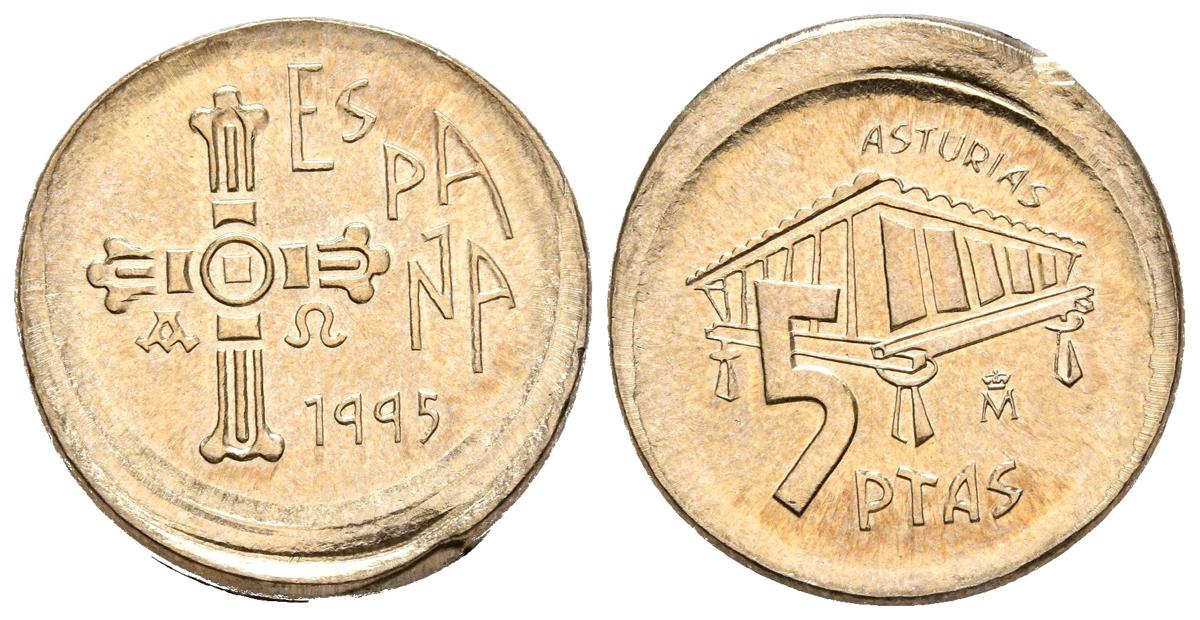 JUAN CARLOS I. 5 Pesetas. 1995. Asturias y León. Acuñación desplazada 3mm. 3,02g. SC. Escasa.