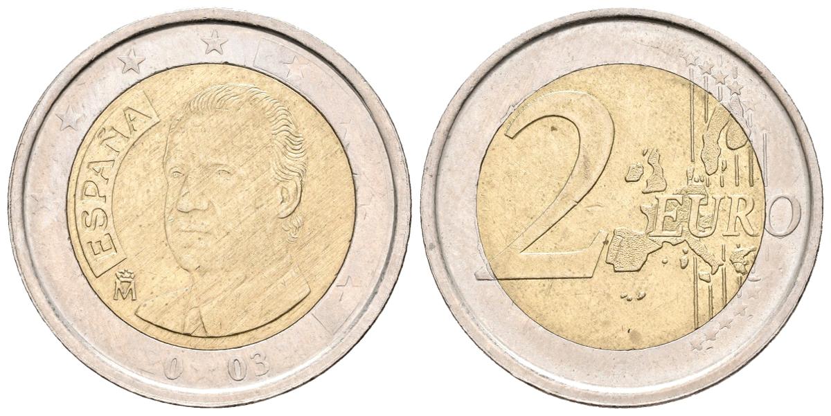 JUAN CARLOS I. 2 Euros. 2003. Acuñación débil afectando a la fecha apreciándose parcialmente. CuNi. 8,47g. MBC+. Rara.