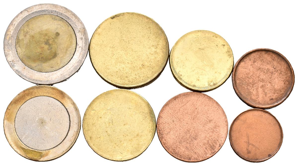 JUAN CARLOS I. Serie completa de cospeles sin acuñar de 8 valores del Euro, desde 1 céntimo hasta 2 euros. Canto de 2 Céntimos y 2 Euros acuñados. MBC+/SC.