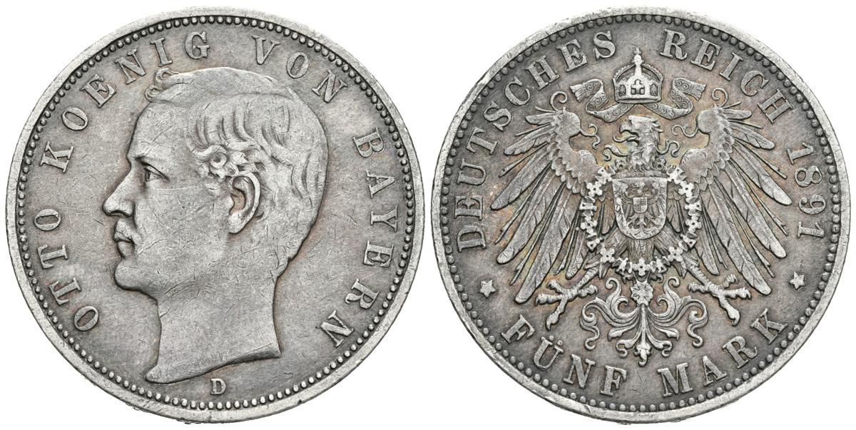 ALEMANIA. Otto. 5 Mark. 1891 D. Jaeger 46. Ar. 27,67g. MBC+.