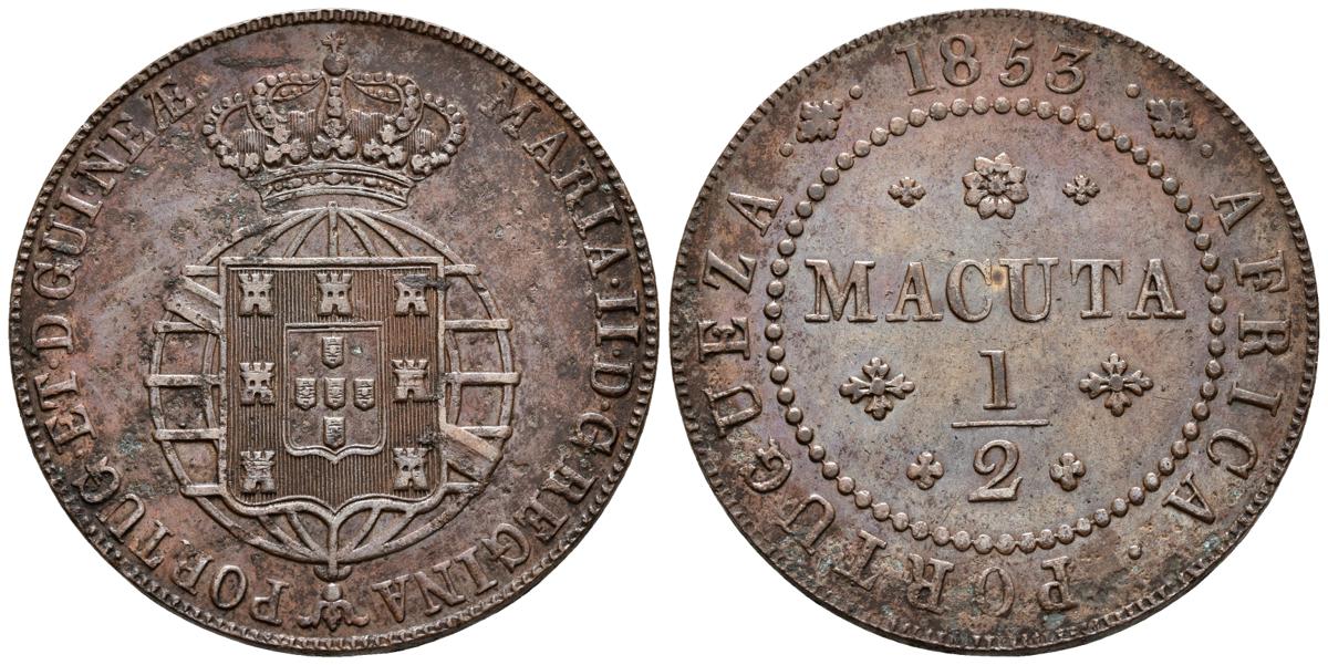 ANGOLA. María II. 1/2 Macuta. 1853. Gomes 01.03. Ae. 18,71g. Bonito tono irisado. MBC+.