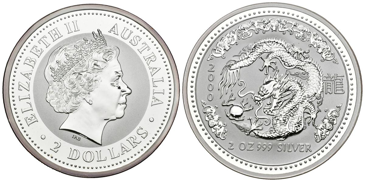 AUSTRALIA. 2 Dollars. Año lunar "Dragón". 2000. Km#523. Ar. 62,53g. Presentada en cápsula original. PROOF.