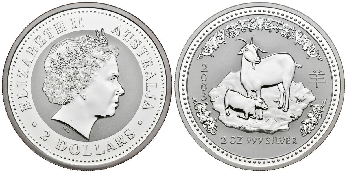 AUSTRALIA. 2 Dollars. Año lunar "Cabras". 2003. Km#679. Ar. 62,68g. Presentada en cápsula original. PROOF.