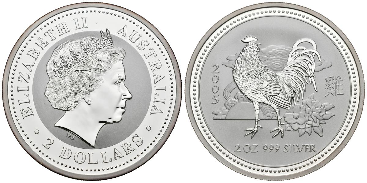AUSTRALIA. 2 Dollars. Año lunar "Gallo". 2005. Km#793. Ar. 62,87g. Presentada en cápsula original. PROOF.