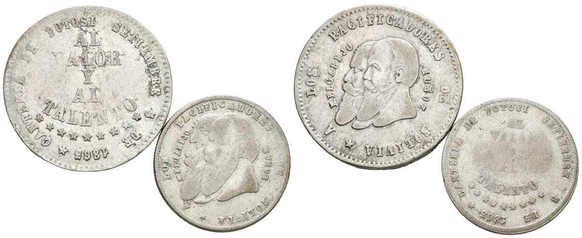 BOLIVIA. 1/4 y 1/2 Melgarejo. 5 Septiembre 1865. Potosí. A/ A LOS PACIFICADORES DE BOLIVIA. Bustos de Melgarejo y Muñoz. R/ AL VALOR Y AL TALENTO-CANTERIA DE POTOSI SETIEMBRE 5 DE 1868. Km#144 y Km#145.2. Ar. 4,94g y 9,84g. BC+/MBC+.
