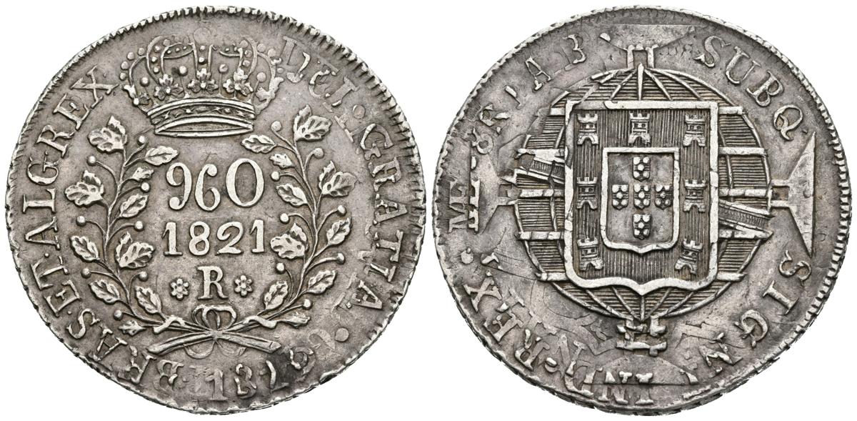BRASIL. Johannes VI. 960 Reis. 1821. Río de Janeiro. Acuñada sobre un 8 reales de Fernando VII. 1819. Lima JP. Km#326.1. Ar. 26,91g. MBC+. Escasa.